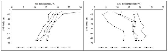 Temperature in the upper 10 cm was especially high in HI and CC parcels, whereas soil moisture, especially in the upper horizon, was lowest in CC and HI parcels and highest in RE (Figure 4, Figure 5). Significant differences were found in soil moisture (F = 107,9, p < 0.001) and temperature (F = 19.09, p = 0.009) throughout the soil profiles between treatments. The highest temperature values and lowest moisture content values were recorded in topsoil at HI (28.9 °C, 8.33%) and CC (29.4 °C, 5,67%) treatment parcels.