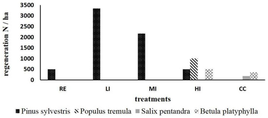The correlation between treatments and overall regeneration number was low when the RE-parcel was included (r = −0.398; p-value = 0.141). However, when considering only treatments with removal (LI, MI, HI and CC) the regeneration number highly correlated negatively with selective logging intensity (r = −0.9; p-value < 0.001). The highest regeneration densities were observed in LI parcels (3333 stems ha−1), followed by MI parcels (2167 stems ha−1) (Figure 6). RE and HI parcels had relatively low regeneration densities but differed in composition. At RE, LI, and MI parcels, we found only Scots pine seedlings and no other tree species. At HI sites, we found low density Scots pine regeneration, but also poplar and birch regeneration. The poorest regeneration densities were observed at CC and RE parcels. The regeneration at CC parcels consisted of only single birches and willows.