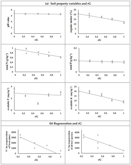 (a) Graphs of the relationships between soil property variables and selective logging intensity (rG; selective logging weight); (b) Graph of the relationship between regeneration (N/ha) and selective logging intensity (rG; selective logging weight).