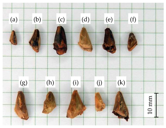 The physical properties of seeds of the following fir species were analyzed in this study (Figure 1): balsam fir (Abies balsamea (L.) P. Mill.), corkbark fir (Abies lasiocarpa var. arizonica (Hook.) Nutt.), Forrest’s fir (Abies forrestii Coltm.-Rog.), grand fir (Abies grandis (Doug. ex D. Don) Lindl.), Japanese fir (Abies firma Sieb. & Zucc.), Korean fir (Abies koreana E. H. Wilson), noble fir (Abies procera Rehd.), Sierra white fir (Abies concolor var. lowiana (Gord.) Lemm.), silver fir (Abies alba P. Mill.), subalpine fir (Abies lasiocarpa (Hook.) Nutt.) and white fir (Abies concolor (Gord.) Lindl. ex Hildebr.). Seeds were obtained in 2017 from the available resources of the Dendrona Company in Pęcice, a supplier of tree, shrub, perennial plant and herbaceous plant seeds.