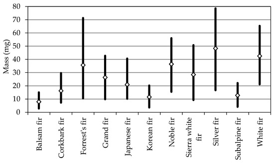 Range of variation in seed mass in selected fir species.
