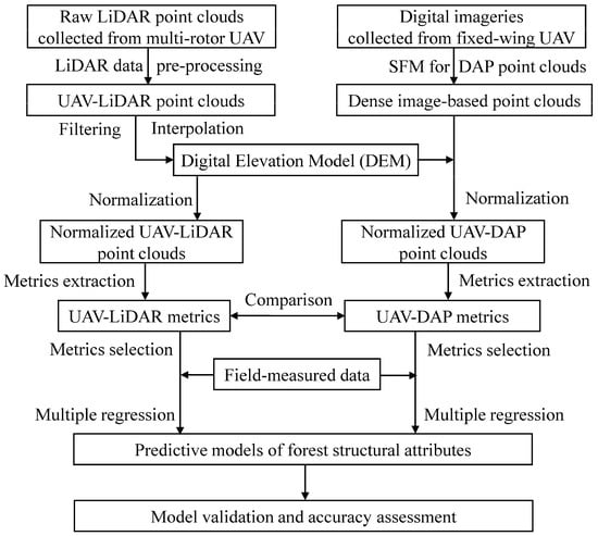 An overview of the UAV data processing workflow is shown in Figure 2. Firstly, dense image-based point clouds were generated using the SFM algorithm to obtain UAV-DAP point clouds. Secondly, normalized UAV-LiDAR point clouds were generated using a digital elevation model (DEM), which was created based on ground point clouds after filtering; then, the DEM was used to normalize the UAV-DAP point clouds. Thirdly, two suites of metrics were derived from the normalized UAV-LiDAR and UAV-DAP point clouds, and then metric comparisons were conducted under different forest conditions. Finally, the accuracies of predictive models of forest structural attributes, which were generated by UAV-LiDAR and UAV-DAP metrics, were compared. Figure 2 provides an overview of the analysis workflow.