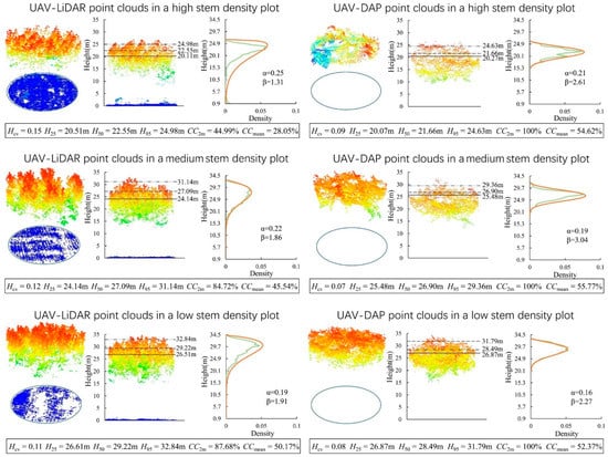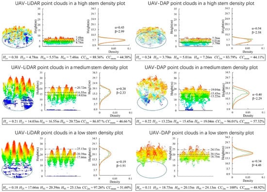 Comparisons of UAV-LiDAR and UAV-DAP point clouds and canopy height distribution profiles in three poplar plots with different stem densities. Metrics are defined in Table 2.