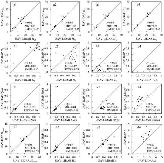 Scatterplots of UAV-LiDAR and UAV-DAP metrics in poplar plots, including (a) percentile height metrics (H25, H50, H75, and H95), (b) density-based metrics (D3, D5, D7, and D9), (c) canopy metrics (Open, Euph, Oligo, and Closed), (d) other metrics (Hmean, Hcv, α, β). Notes: MD represents the average difference between two suites of metrics, RMSD indicates the general level of difference, and r represents the correlation relationship between UAV-LiDAR and UAV-DAP metrics. For metric descriptions, see Table 2.