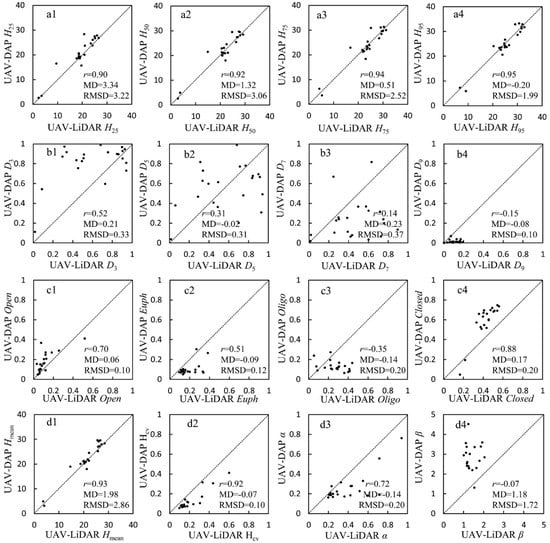 Scatterplots of UAV-LiDAR and UAV-DAP metrics in dawn redwood plots, including (a) percentile height metrics (H25, H50, H75, and H95), (b) density-based metrics (D3, D5, D7, and D9), (c) canopy metrics (Open, Euph, Oligo, and Closed), and (d) other metrics (Hmean, Hcv, α, β). Notes: Mean difference (MD) represents the average difference between two suites of metrics, root-mean-square deviation (RMSD) indicates the general level of difference, and r represents the correlation relationship between UAV-LiDAR and UAV-DAP metrics. For metric descriptions, see Table 2.