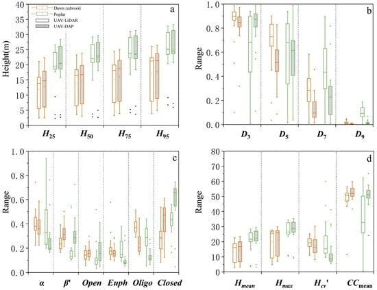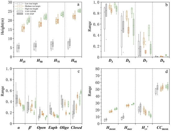 Boxplots of UAV-LiDAR and UAV-DAP metrics in dawn redwood plots, which were grouped by field-measured Lorey’s mean height, including (a) percentile height metrics (H25, H50, H75, and H95), (b) density-based metrics (D3, D5, D7, and D9), (c) canopy metrics (α, β, Open, Oligo, Euph, and Closed), and (d) other metrics (Hmean, Hmax, Hcv, and CCmean). Notes: β’: β/10; Hcv’: Hcv × 100%. Metrics are described in Table 2.