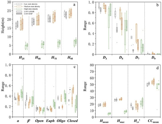Boxplots of UAV-LiDAR and UAV-DAP metrics in dawn redwood plots, which were grouped by field-measured stem density, including (a) percentile height metrics (H25, H50, H75, and H95), (b) density-based metrics (D3, D5, D7, and D9), (c) canopy metrics (α, β, Open, Oligo, Euph, and Closed), and (d) other metrics (Hmean, Hmax, Hcv, and CCmean). Notes: β’: β/10; Hcv’: Hcv × 100%. Metrics are described in Table 2.