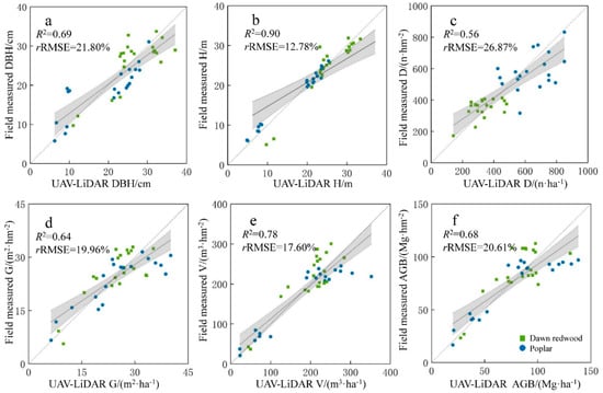 Scatterplots of forest structural attributes between field-measured and UAV-LiDAR model-predicted results for cross-validation. (a) Mean diameter at breast height; (b) Lorey’s mean height; (c) stem density; (d) basal area; (e) volume; (f) aboveground biomass. Notes: DBH: mean diameter at breast height; H: Lorey’s mean height; D: stem density; G: basal area; V: volume; AGB: aboveground biomass.