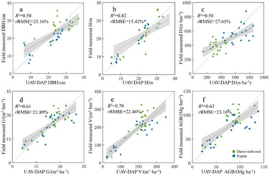 Scatterplots of forest structural attributes between field-measured and UAV-DAP model-predicted results for cross-validation. (a) Mean diameter at breast height; (b) Lorey’s mean height; (c) stem density; (d) basal area; (e) volume; (f) aboveground biomass. Notes: DBH: mean diameter at breast height; H: Lorey’s mean height; D: stem density; G: basal area; V: volume; AGB: aboveground biomass.