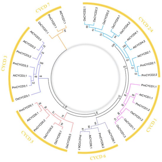 The organs of higher plants are constantly evolving throughout their life cycle, and this process relies on the flexible control of cell division and cell proliferation. In the model plant Arabidopsis, there are 32 cyclin genes that can regulate the cell cycle, including 10 A-type, 11 B-type, 10 D-type, and 1 H-type [47]. Each cyclin gene exhibits a specific expression pattern in the cell cycle. In general, A-type cyclins (CYCAs) not only control the progression of S-M phase, but also regulate the transformation of G2/M phase and the progression of M phase with CYCBs [48,49]. CYCDs are expressed continuously in the cell cycle to control G1/S transition and cell proliferation in response to corresponding external signals, including plant hormones and carbon sources [8,15]. In this study, 12 PmCYCD genes in P. mume were identified and named in the light of homologs in A. thaliana. The results of the ML phylogenetic tree illustrated that six subgroups of PmCYCDs were similar to those in A. thaliana and O. sativa. Each subgroup of CYCD was composed of at least one gene: 2 in CYCD1 subgroup, 2 in CYCD2/CYCD4 subgroup, 3 in CYCD3 subgroup, 2 in CYCD5 subgroup, 2 in CYCD6 subgroup and 1 in CYCD7 subgroup (Figure 1 and Table S2).