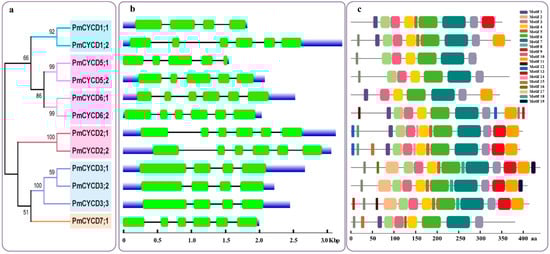 To assess and increase insights into the diversity of gene structure, the exon/intron structures of PmCYCDs were constructed on the basis of an independent phylogenetic tree of PmCYCDs using complete protein sequences (Figure 2a). The number of exons/introns in the same subfamilies usually showed similarity, with most introns ranging from 3 to 5 (Figure 2b). For instance, the subfamily PmCYCD2/PmCYCD6 shared 5 introns, but the subfamily PmCYCD3 contains 3 introns, and PmCYCD5 contains 4 introns. Intron numbers in subfamily PmCYCD1 were variable, PmCYCD1;1 contained 3 introns and PmCYCD1;2 contained 5 introns.