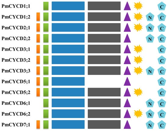 Five non-contiguous conserved amino acids [arginine (R), aspartic acid (D), leucine (L), lysine (K), and glutamic acid (E)] have been confirmed to be essential for the structure of cyclins, which are also conserved in CYCDs [43]. The result of multiple-sequence alignment, showed that 12 PmCYCDs contain all the above-mentioned conserved amino acids (Figure S2).