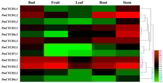 The expression level of PmCYCDs was examined in five different types of organ tissue: Root, stem, leaf, bud, and fruit (Table S4) with our previous transcriptome data (No. GSE40162). As shown in Figure 4, we found that PmCYCDs exhibited specific expressions in five different organs. Most of the genes presented relatively higher transcript level in the stem, except PmCYCD6;1 and PmCYCD2;2, PmCYCD2;1, PmCYCD3;2 and PmCYCD3;3 had high expression levels in five samples. PmCYCD1;1 and PmCYCD5;1 had higher expression levels in both the buds and stems, suggesting simultaneous involvement in the regulation of bud and stem development. The expression levels of the PmCYCD6;1 and PmCYCD7;1 genes were very low in above five organs.