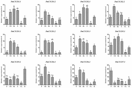 Expression analysis of 12 PmCYCD genes under different tissues by qRT-PCR. The relative quantification method (2−ΔΔCT) was used to evaluate quantitative variation under different tissues. Error bars represent standard error for three replicates. Different lowercase letters in column differed significantly based on Tukey’s test (p < 0.05) after one-way ANOVA. F, flower; YB, young buds; Sh, shoot; S, stem; YL, young leaf; R, root.