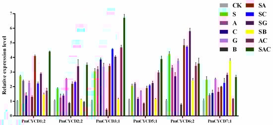 As essential regulators of the cell cycle, CYCD genes are important for understanding their differential responses to mitogenic signals. As shown in Figure 6, the expression pattern of PmCYCD genes was observably induced by sucrose and phyto-hormones. The transcript level of PmCYCD6;2 was significantly up-regulated 4.2-fold with sucrose treatment. In the presence of sucrose, PmCYCD1;2, PmCYCD3;1, PmCYCD5;1, and PmCYCD7;1 can induce 2–3 fold increase in expression level, while the transcript level of PmCYCD2;2 was less than 2-fold. Auxin and cytokinin could strongly stimulate the expression of PmCYCD3;1, PmCYCD6;2, and PmCYCD1;2. When GA3 was applied, the transcript levels of PmCYCD1;2, PmCYCD2;2, PmCYCD3;1, PmCYCD6;2, and PmCYCD7;1 were markedly upregulated, especially, expression level of PmCYCD3;1, and PmCYCD6;2, was more than three times higher than that before treatment. The presence of ABA resulted in a distinct down-regulation of most PmCYCDs, except PmCYCD7;1 and PmCYCD1;2. With the combinations of auxin, cytokinin, gibberellin, and sucrose, the expression level of all PmCYCDs was significantly up-regulated by more than two times than in the control, suggesting that there was a synergistic effect between different hormones, or between hormones and sucrose on induced expression of PmCYCDs. Interestingly, the promoting effects on PmCYCD1;2, PmCYCD2;2, and PmCYCD5;1 transcription were not activated when ABA and sucrose were both applied.