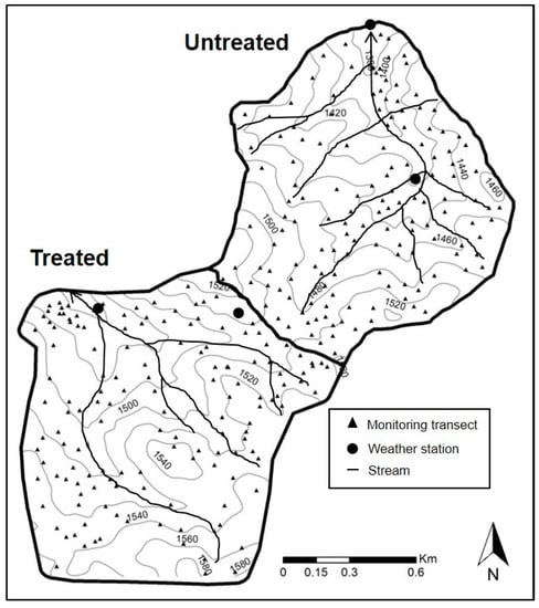 The line-point intercept sampling method, adapted from Herrick et al. [], was used to estimate percent foliar cover, percent litter and percent bare ground represented in two individual sampling layers (i.e., top canopy and soil surface). In the summer of 2014, a total of 289 ten-meter transects were placed throughout both watersheds; 143 in the treated and 146 in the untreated (Figure 1). Transect locations were established to provide equal representation of aspect and elevation. Transects were permanently marked and aligned perpendicular to slope. The transects were established to avoid crossing ecotones between plant community types and soil types, thereby reducing risk of spatial heterogeneity effects as a result of differing abiotic and biotic factors. Vegetation points and soil surface cover were read every 1 m along the transect line. Canopy cover was recorded by species, and additional features were characterized as either herbaceous litter or woody litter (>5 mm). Soil surface measurements were of basal cover of plant species, rock (>5 mm), bedrock, moss, lichen crust, soil, embedded litter, or duff. Species functional groups were categorized as annual forb, perennial forb, annual grass, perennial grass, shrub, or tree. Data from each 10-m transect was used to estimate average percent total canopy cover by vegetative species, relative cover of each functional group, percent bare ground, and percent litter cover. Relative cover was estimated for each transect by dividing the sum of occurrences for each functional group by the sum of all occurrences.