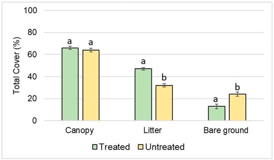Mean (± SE) values of total canopy cover, litter and bare ground for the treated and untreated watersheds. Means with the same letter are not significantly different (p > 0.05).