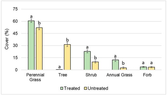 Mean (± SE) values of relative canopy cover by functional vegetation group across the treated and untreated watersheds. Means with the same letters are not significantly different (p > 0.05).
