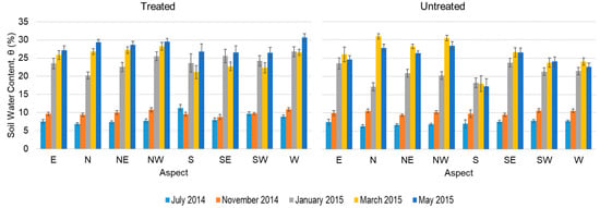 Distribution of mean soil water content, θ (± SE) by aspect and by measurement month (July and November 2014, and January, March, and May 2015) in the treated and untreated watersheds.