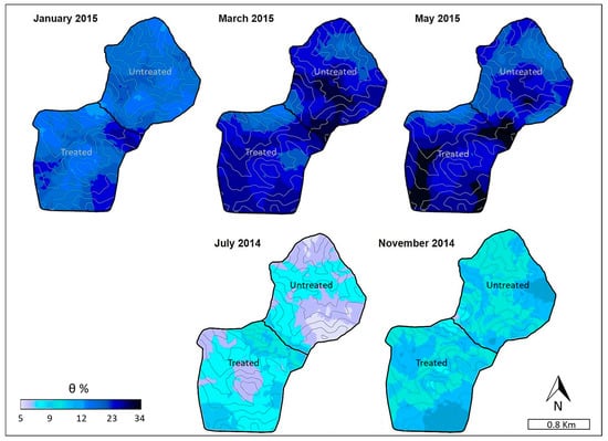 Using GIS analysis and the ordinary kriging method, we generated θ surfaces across spatial and temporal scales for both watersheds. The interpolated θ classifications ranged from 5% to 11% in July 2014; 6% to 12% in November 2014; 12% to 30% in January 2015; 15% to 32% in March 2015; and 16% to 40% in May 2015. The range of interpolated θ values was consistent with the range of measured θ values derived from the portable sensor readings for each measurement period. Figure 5 shows the seasonal changes in θ from the dry to the wet seasons in both watersheds. During the dry season months (July 2014 and November 2014), greater θ values were observed in the higher elevation hillsides in each watershed. As topsoil conditions became progressively wetter throughout winter and spring, greater θ values were observed near the stream channels and at the valley bottoms. The effects of subsurface lateral flows on θ at lower elevation or near channel sites during the wettest months (March 2015 and May 2015) were highly visible during field data collection. This was even more apparent in the treated watershed, as indicated by the θ surface image corresponding to the May 2015 records.