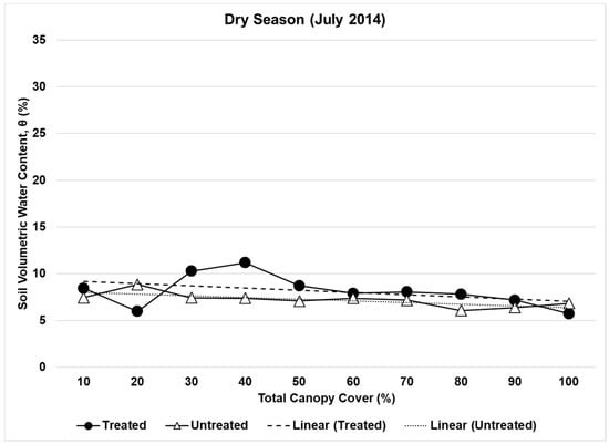 Mean θ (± SE) relative to total canopy cover (%) for the month of July 2014 (dry season) in both watersheds. Mean θ was estimated based on θ records from 142 transects in the treated watershed and from 140 transects in the untreated.