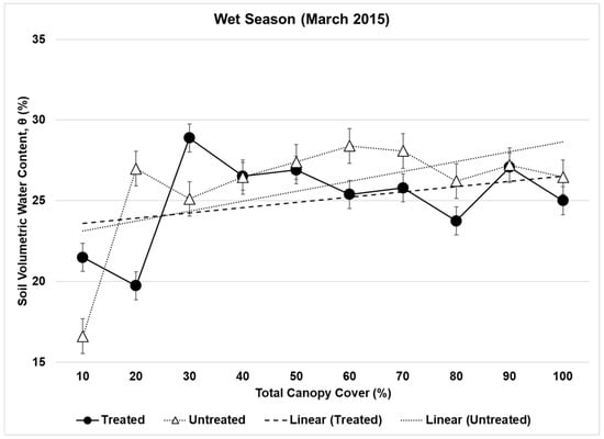 Mean θ (± SE) relative to total canopy cover (%) for the month of March 2015 (wet season) in both watersheds. Mean θ was estimated based on θ records from 143 transects in the treated watershed and from 146 transects in the untreated.