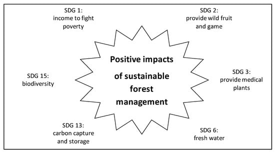 The challenge is to balance environmentally-related SDGs like SDG 15 with other human-centered SDGs. Coherent policies are needed across different SDGs and sectors []. The direct outputs of the forest sector (see Section 3.1: timber production, manufacturing of forest products, and tourism) can support the achievement of several SDGs. Well managed forests can have a positive impact on biodiversity (SDG 15), create income to fight poverty (SDG 1), provide wild fruit and game to fight hunger (SDG 2), provide medical plants (SDG 3), provide freshwater for drinking and irrigation (SDG 6), and capture and storage carbon (SDG 13) [] (see Figure 1).