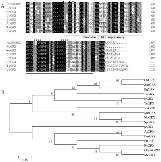 Sequence alignment and phylogenetic analyses of HbSRGRX1 and other plant GRXs. (A) Dark and gray indicate identical and similar amino acids, respectively. The straight line, asterisk, and dotted line represent the conserved motif of the thioredoxin_like superfamily, GSH binding site, and active site, respectively. (B) The phylogenetic tree was generated by MEGA (Molecular Evolutionary Genetics Analysis) 6.06 using the neighbor-joining method with 1000 bootstrap tests. The scale bar represents the estimated number of amino acid substitutions per site. The accession numbers of GRX proteins are as follows: Manihot esculenta (MeGRX, XP 021594601.1), Ricinus communis (RcGRX, XP 002524673.1), Populus trichocarpa (PtGRX, XP 002298529.2), Prunus mume (PmGRX, XP 008230572.1), Arabidopsis thaliana (AtGRX, NP 198853.1), Jatropha curcas (JcGRX, NP 001295635.1 ), Theobroma cacao (TcGRX, XP 007031532.1), Juglans regia (JrGRX, XP 018842397.1), Solanum pennellii (SpGRX, XP 015077482.1), Nicotiana attenuate (NaGRX, XP 019224739.1), Morus notabilis (MnGRX, XP 024029530.1), Vitis vinifera (VvGRX, XP 002276266.1), Triticum aestivum (TaGRX, AAP80853.1), Elaeis guineensis (EgGRX, XP 010940165.1), Zea mays (ZmGRX, NP 001158948.1), Oryza sativa (OsGRX, XP 015626005.1).