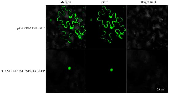 To further investigate the subcellular localization of HbSRGRX1 in cells, the N. benthamiana leaves were infiltrated with the A. tumefaciens harboring pCAMBIA1302-HbSRGRX1-GFP vector and observed with a confocal microscope. The results demonstrated that the fluorescent signal was examined in the nuclei (Figure 2), indicating that HbSRGRX1 was a nucleus located protein.