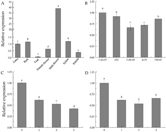 The expression of HbSRGRX1 was examined in seven tissues, including latex, leaf, bark, male flower, female flower, xylem, and petiole. As shown in Figure 3A, HbSRGRX1 displayed a tissue-specific expression profile. The expression of HbSRGRX1 was highest in male flowers, which was strikingly higher than in other tissues (p < 0.05), 38.9- and 617.5-fold over its expression in latex and leaf, respectively. In addition, HbSRGRX1 was differentially expressed in five different varieties of rubber trees, including Reyan 7-33-97, 7-20-59, 8-79, Reken 523, and PR107. The expression level of HbSRGRX1 was significantly higher in Reyan 7-33-97 than other varieties, the lowest in Reyan 7-20-59 and 8-79 (Figure 3B). Together, the above results indicated that HbSRGRX1 might have particular functions in different tissues and varieties.