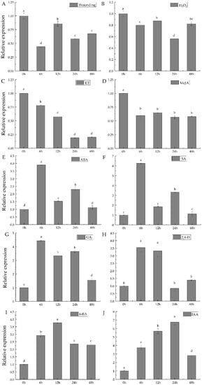 Tapping is a kind of mechanical wounding, over tapping or excessive stimulation by ET can elicit oxidative stresses of laticifer cells and the balance between ROS production and scavenging is broken, resulting in ROS burst and the onset of TPD in Hevea brasiliensis []. Multiple hormones are reported to regulate the expression of GRX genes in rice [,]. Thus, the expression profiles of HbSRGRX1 in latex were systematically investigated in response to wounding, H2O2, ET, MeJA, ABA, SA, GA3, 2, 4-D, 6-BA, and IAA using qPCR method. As shown in Figure 4, all the treatments regulated the expression of HbSRGRX1, but the expression profiles showed obvious variations. After wounding and H2O2 treatments, HbSRGRX1 expression indicated an irregular fluctuation and was generally suppressed, with the lowest expression at 6 h and 24 h, respectively (Figure 4A,B). With ET treatment, the expression of HbSRGRX1 significantly decreased to the lowest level at 24 h (Figure 4C). Similarly, its expression was rapidly inhibited at 6 h after MeJA treatment and kept a similar expression level from 6 h to 48 h (Figure 4D). HbSRGRX1 showed similar expression profiles and was quickly induced, all rising to the highest point at 6 h, and then markedly declining at 12 h after ABA, SA, and GA3 treatments (Figure 4E–G). As for 2, 4-D, 6-BA, and IAA treatments, HbSRGRX1 exhibited a similar expression trend of first rising and then declining, reaching the peaks at 6 h, 12 h and 24 h, respectively (Figure 4H–J). Taken together, these results demonstrated that HbSRGRX1 might have distinct functions in response to wounding, H2O2, and hormones.
