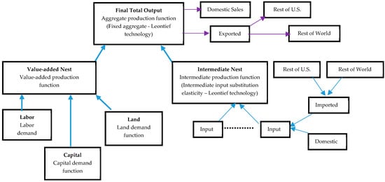 This analysis is based on a CGE model originally developed by Lofgren et al. [] and later customized by Holland et al. [] to be compatible with the IMPLAN (IMpact analysis for PLANning) dataset. The model is based on traditional neoclassical economic theory. The model is deterministic in nature with assumptions of small-open-economy (price taker) and constant returns to scale technology. In the model, producers are assumed to maximize profits (defined as the difference between revenue earned and the cost of factors and intermediate inputs) subject to constant returns to scale technology with three factors of production: labor, capital, and land. Production is specified in a two-level nest where at the top level, a composite of value-added and a composite of intermediate inputs are demanded in fixed proportions to produce each unit of output. At the bottom level, the three primary factors of production are assumed to substitute smoothly through a CES composite value-added function. Intermediate inputs, on the other hand, are determined by fixed shares through Leontief function (Figure 1).