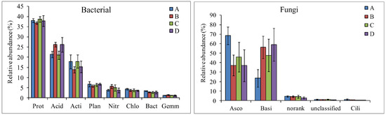 The composition and relative abundance of the soil microbial community at the phylum level. Prot indicates Proteobacteria, Acid indicates Acidobacteria, Acti indicates Actinobacteria, Plan indicates Planctomycetes, Nitr indicates Nitrospirae, Chlo indicates Chloroflexi, Bact indicates Bacteroidetes, Gemm indicates Gemmatimonadetes, Asco indicates Ascomycota, Basi indicates Basidiomycota, norank indicates norank_k__Fungi, unclassified indicates unclassified_k__Fungi, and Cili indicates Ciliophora. A indicates close-to-nature forest management (CNFM), B indicates structure-based forest management (SBFM), C indicates unmanaged control (CK), and D indicate secondary forest comprehensive silviculture (SFCS).