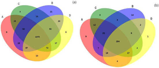 Venn diagrams based on OTUs of soil bacterial (a) and fungal (b) community with different forest management methods. A indicates close-to-nature forest management (CNFM), B indicates structure-based forest management (SBFM), C indicates unmanaged control (CK), and D indicate secondary forest comprehensive silviculture (SFCS).