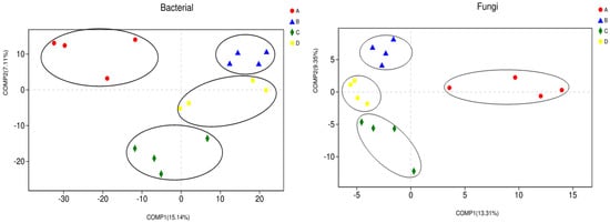 Structural similarity analysis of soil microbial communities among different management treatments by partial least squares discriminant (PLS-DA). A indicates close-to-nature forest management (CNFM), B indicates structure-based forest management (SBFM), C indicates unmanaged control (CK), and D indicates secondary forest comprehensive silviculture (SFCS).