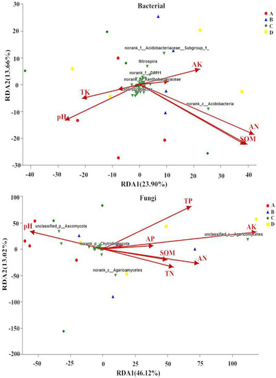 Furthermore, the relative abundances of the fungal phyla, Basidiomycota and Ciliophora had significant negative correlations with pH (p = 0.038) and TK (p = 0.041) (Table S6, Supplementary Materials), and the abundance of Sordariales belonging to the phylum Ascomycota was positively correlated with SOM (p = 0.027), TN (p = 0.036), AN (p = 0.024), and TP (p = 0.04) (Table S7 Supplementary Materials).