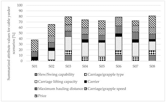 The attributes of the eight cable yarder scenarios were evaluated by summarizing the products of the respective attribute weight with the single score attribute. In the best case the sum would have a score of 100% and in the worst case 0%. In realistic conditions, usually no scenario would fulfill the most preferable configuration for all attributes. This means, that a value of 80% is a reasonable result (Figure 1).