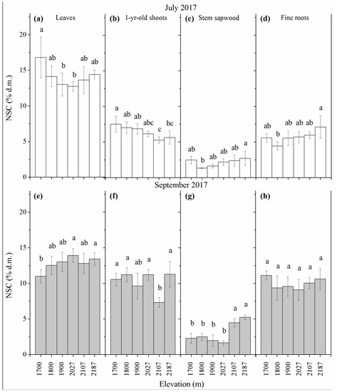Elevation did not affect leaf NSC but significantly affected the NSC concentrations in shoots, stem sapwood, and roots (Table 2). Tissue NSC concentrations varied significantly with time (season), and time interacted with elevation to influence the NSC concentrations in aboveground tissues (leaves, shoots, and stem sapwood) (Table 1). Leaf NSC concentration was higher in July than in September, whereas NSC concentrations in sink tissues (shoots, stem, and roots) were higher in September than in July (Figure 1a–h). Root NSC concentrations seemed to be stable across elevations in both July and September (Figure 1d,h). Apart from this, clear elevational trends in NSC were found only in July shoots where the NSC concentration significantly decreased with increasing elevation (Figure 1b), and in September stem sapwood where the NSC concentrations were significantly higher at higher elevations (Figure 1g).