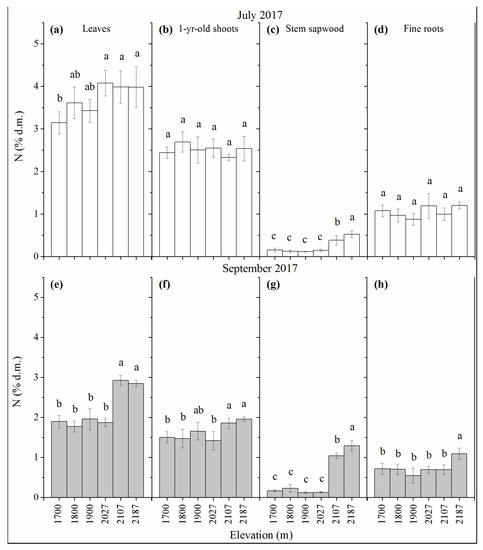 Seasonal tissues concentration (Mean ± 1SD; % of dry matter) changes in total nitrogen (N) of Betula ermanii trees along elevational gradients in Changbai Mountain (n = 5 for each elevational site and tissue type). Different letters display significant differences at the 0.05 level among elevations as determined by Tukey’s HSD test.