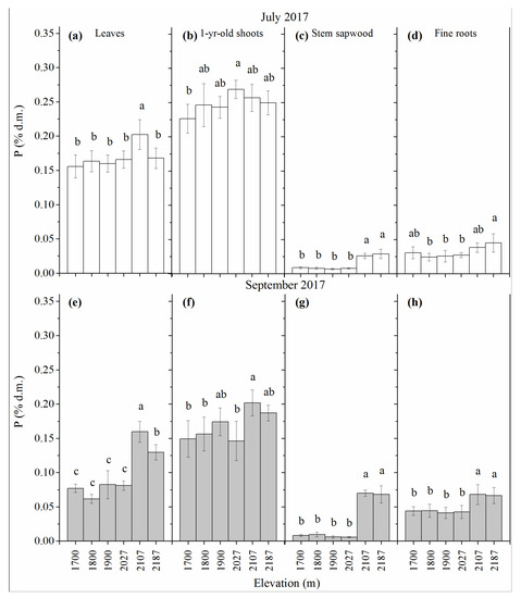 Seasonal tissues concentration (Mean ± 1SD; % of dry matter) changes in total phosphorus (P) of Betula ermanii trees along elevational gradients in Changbai Mountain (n = 5 for each elevational site and tissue type). Different letters display significant differences at the 0.05 level among elevations as determined by Tukey’s HSD test.