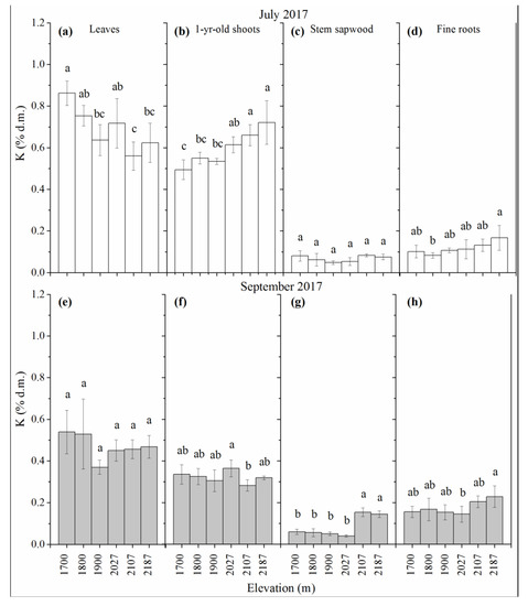 Seasonal tissues concentration (Mean ± 1SD; % of dry matter) changes in total potassium (K) of Betula ermanii trees along elevational gradients in Changbai Mountain (n = 5 for each elevational site and tissue type). Different letters display significant differences at the 0.05 level among elevations as determined by Tukey’s HSD test.