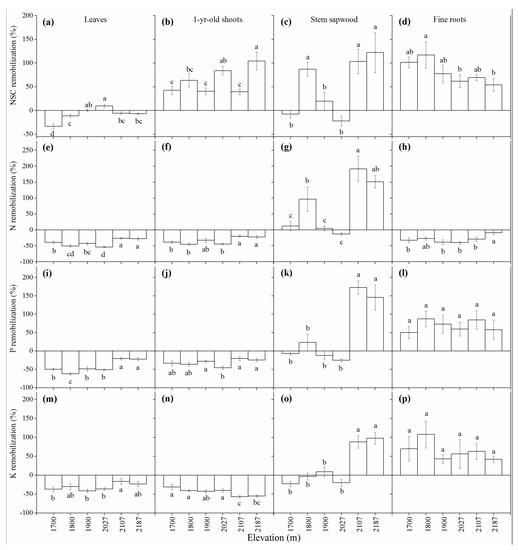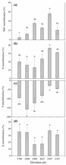 At the end of season, NSC reallocated from leaves to woody tissues (Figure 5a–d) and N accumulated only in stems (Figure 5g), whereas P and K seemed to store in stems and roots (Figure 5k,l,o,p), indicating tissue- and resource-dependent reallocation or accumulation (Table 4). B. ermanii leaves reallocated NSC to other tissues (Figure 5a; Table 4), leading to decreases in leaf NSC (Figure 1e vs. Figure 1a) but increases in NSC concentrations in shoots (Figure 1f vs. Figure 1b), stem sapwood (Figure 1g vs. Figure 1c), and roots (Figure 1h vs. Figure 1d), and thus an NSC accumulation in those storage tissues (Figure 5b–d). In line with previous studies, our results confirmed that leaf carbon compounds in deciduous trees were reallocated and stored in ligneous tissues, particularly in stems and roots [5,8]. Leaf carbon components recycled through remobilization from leaves to storage tissues before leaf senescence are particularly important for regrowth of new leaves in a leafless state of deciduous trees in early spring [5,9,10]. We found that the NSC remobilization efficiency of B. ermanii leaves ranged from 6% at high elevation to 33% at low elevation (Figure 5a). Chapin et al. (1990) proposed a carbon remobilization efficiency of ~10% based on an assumption that the loss of leaf weight was a direct result of carbon remobilization [5]. Similarly, Eckstein et al. (1998) proposed a carbon remobilization efficiency of 6%–13% for deciduous species [35].
