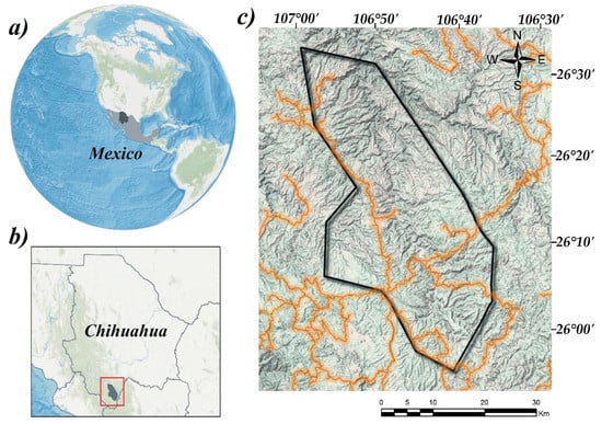 Geographical location of the study area: (a) Mexico, (b) “Ejido Chinatu” location in Chihuahua, Mexico, (c) “Ejido Chinatu”. Boundary of the studied area (—), principal roads (—).