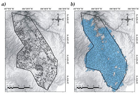 The variables were measured in 345 watershed, delimited within the study area (Figure 2). The size of the watershed varied from 100 to 2100 ha, with an average of 424.02 ha and a standard deviation of 274.07 ha. The geographic information system (GIS) was used to delineate watershed. A digital terrain model [] was used for the generation of the watersheds []. The details of the procedure for the delimitation of watersheds in GIS can be found in the study by Hamdy et al. [].