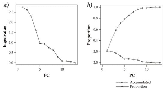 In the correlation analysis, we found significant positive correlations among the variables (Table 2). The evaluation shows different relationship conditions for the forest in the study area; this condition allowed us to perform a differential characterization as a measure to explain the forest heterogeneity. The PCA showed that the first four components explain 71% of the total variability provided by the 13 original variables. The values of the eigenvalue and the accumulated variability explain the proportion of the original variables (Figure 3).