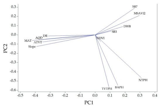 Loading plot of the first two principal components (PC) showing the contribution of each variable.