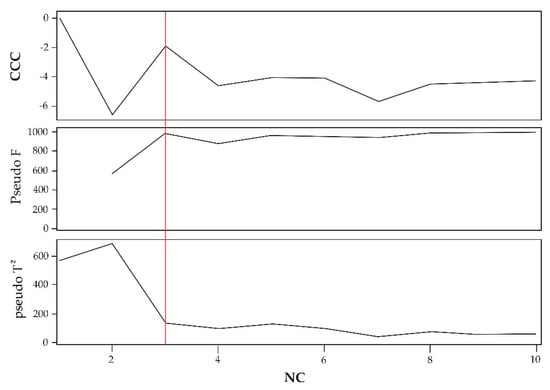 Statistical criteria for determining the number of groups to be established. CCC = Cubic Clustering Criterion. NC = Number of clusters.