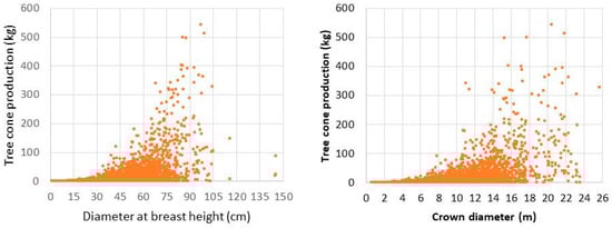 Cone production per tree in relation to the diameter at breast height and crown diameter [].