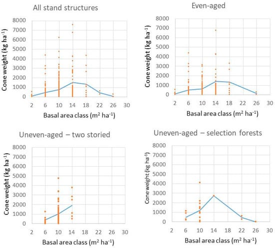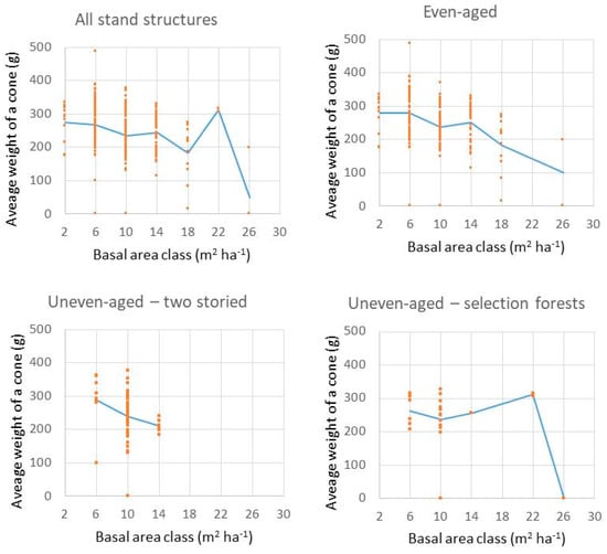 Impact of basal area on cone quality (using average cone weight as a proxy for cone quality) for the different stand structures analysed []. The blue line represents the average production (all plots in all sampled years).
