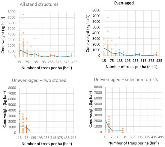 Relationship between cone production and number of trees ha−1 for the different stand structures considered []. The blue line represents the average production (all plots in all sampled years).